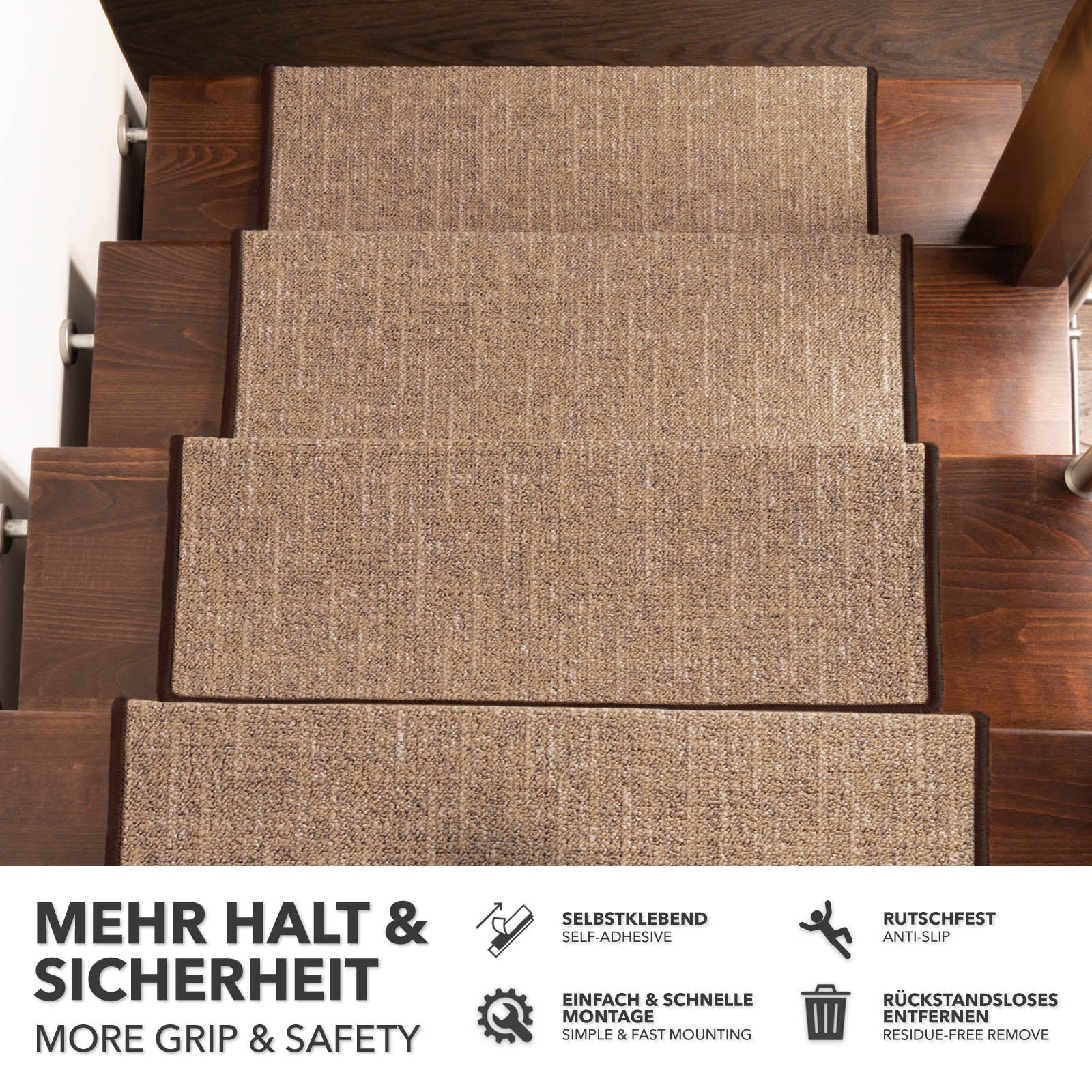 Hinweis: Wir empfehlen, die Stufen vor Anbringung der Stufenmatten zu säubern. Ebenso ist darauf zu achten, dass die Stufen absolut trocken sind, bevor der Klebestreifen entfernt und die Matte positioniert wird.